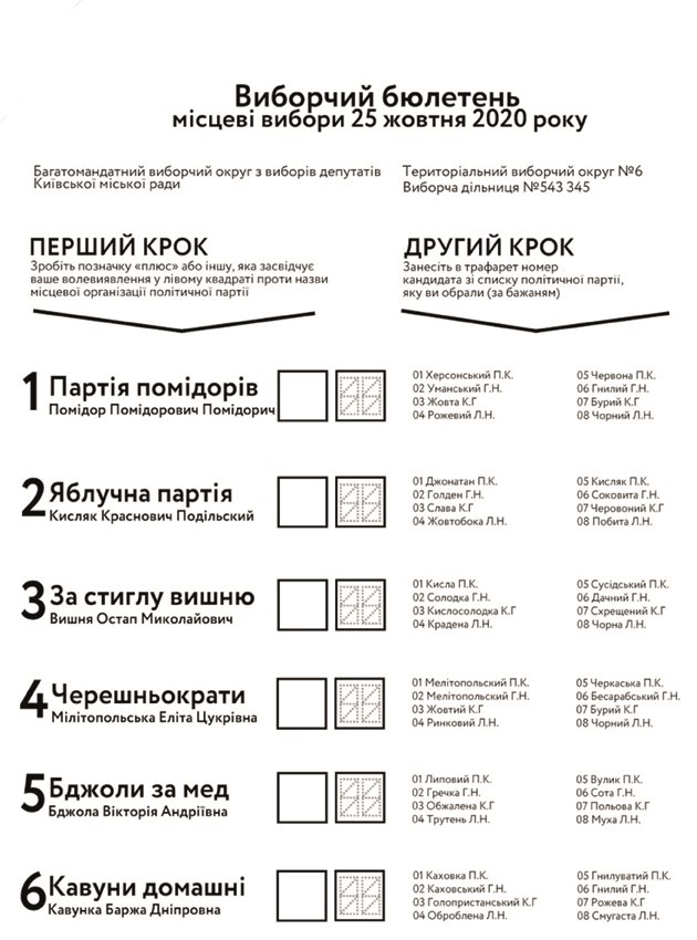 Фахівці громадянської мережі ОПОРА розробили модель нового бюлетеня для місцевих виборів. Усі політсили і кандидати, зазначені у цьому прикладі, вигадані.