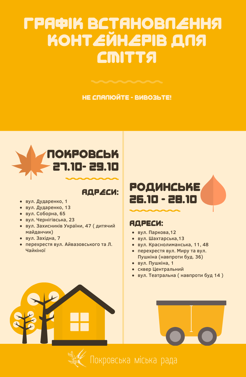 30 великих контейнерів для сміття побувають у 220 точках Покровської громади, аби мешканці змогли прибрати опале листя та гілля. Для жителів послуга буде безкоштовною, адже депутати на ці потреби виділили 100 тис. грн.